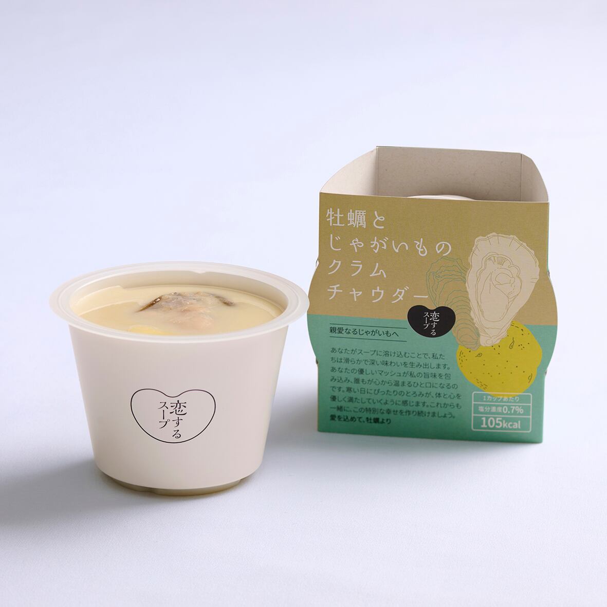 体内の塩分量を整える効果があるとされるカリ ウムを含む「じゃがいも」と免疫力アップ、疲労回 復に効果があるとされるタウリンを多く含む「牡 蠣」を材料にした、クラムチャウダーです。じゃが い も 、玉 ね ぎ 、え の き を 野 菜 エ キ ス( キ ャ ベ ツ 、か ぼ ち ゃ 、玉 ね ぎ、に ん じ ん )と 牛 乳 で じっくり を 煮 込み、さらにバターでソテーした牡蠣を加えて煮 込みます。滑らかなじゃがいものスープに染み込 んだ牡蠣の旨味がリッチな味わいのクラムチャ ウダーに仕上がりました。
