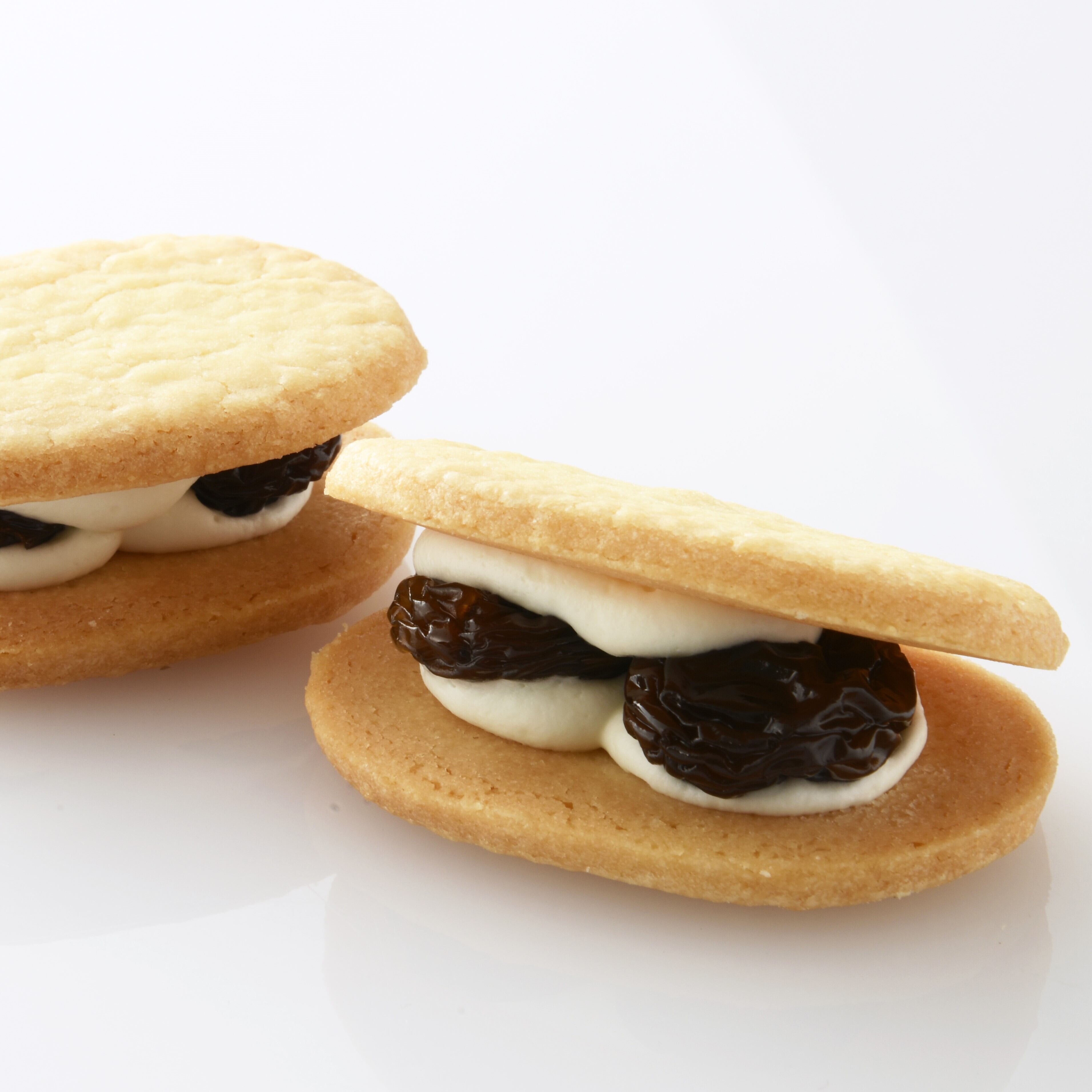 甘さを抑えたクリームと大粒レーズンをサックサクのクッキーでサンドしました