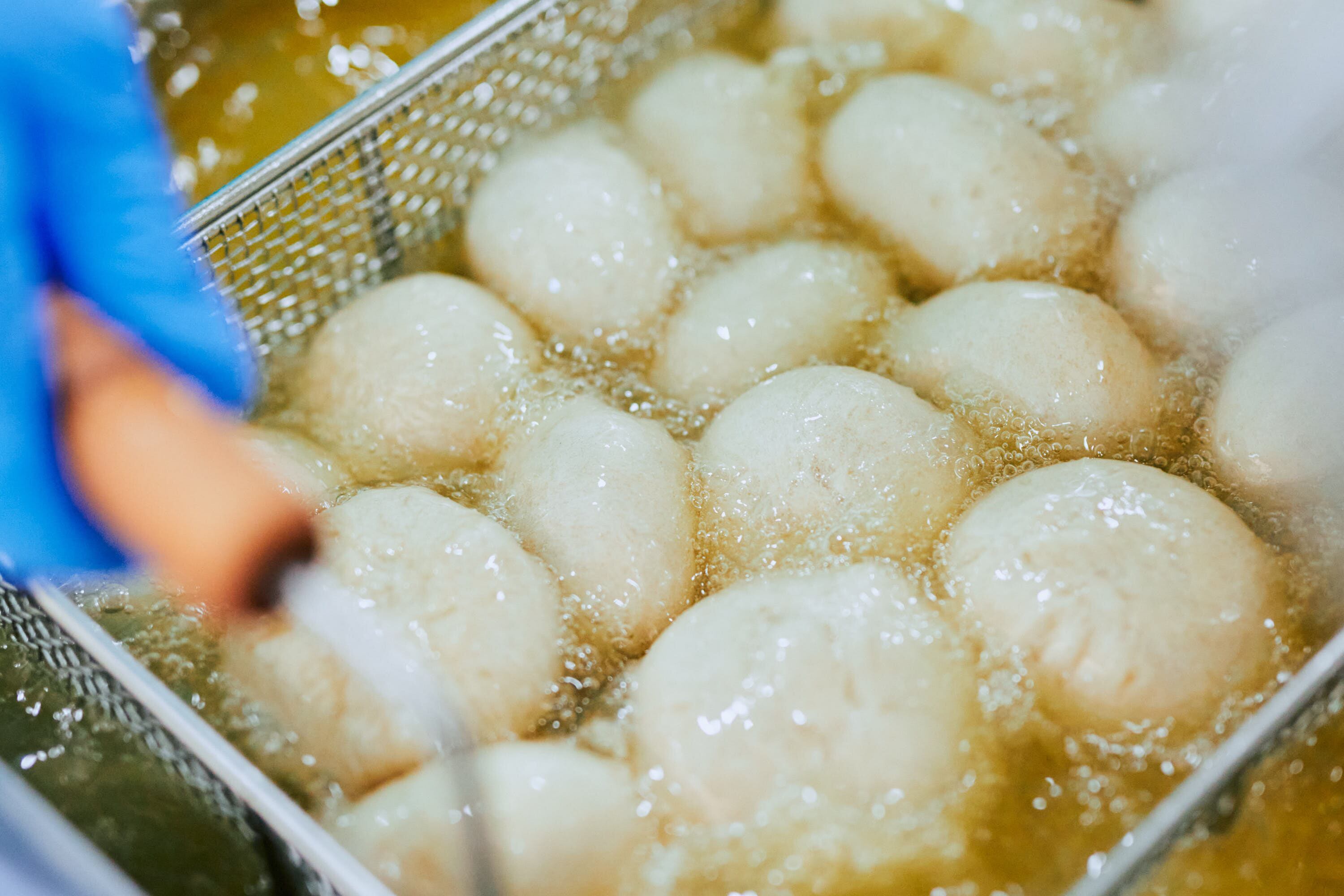 子どもから大人まで食べやすいおやきを目指し、小麦粉に蕎麦粉をブレンドした独特の生地を使用。創業時にはパン屋であった技術を活かし、「もちもち」の生地で具材包んでいます。また油でサッと揚げてから高温のオーブンで焼き上げる独自の製法によって、こんがり、ふっくらとした食感が特徴です。食べやすく、冷めても美味しいおやきを目指しています。