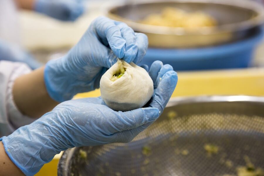 1日に約1万個のおやきを製造していますが、野菜の具材は今も一つひとつ手包みで行っています。具がたっぷり詰まったおやきを作りたい。その思いから、地元で受け継がれる包み方で丁寧にこだわりの具材を包んでいます。