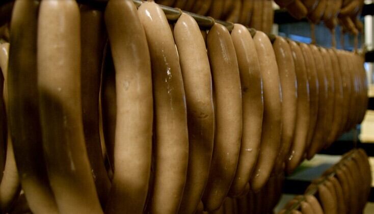 新鮮な国産豚うで肉を成形して漬け込み、1週間程度冷蔵庫で熟成させて肉の旨味を引き出した後に、荒びきにして天然腸に充填します。手ひねりを行い、国産桜チップで燻煙して仕上げました。天然腸のパリッとした食感をお楽しみください。焼く・ボイルにて中心部まで温まればお召し上がりいただけます。