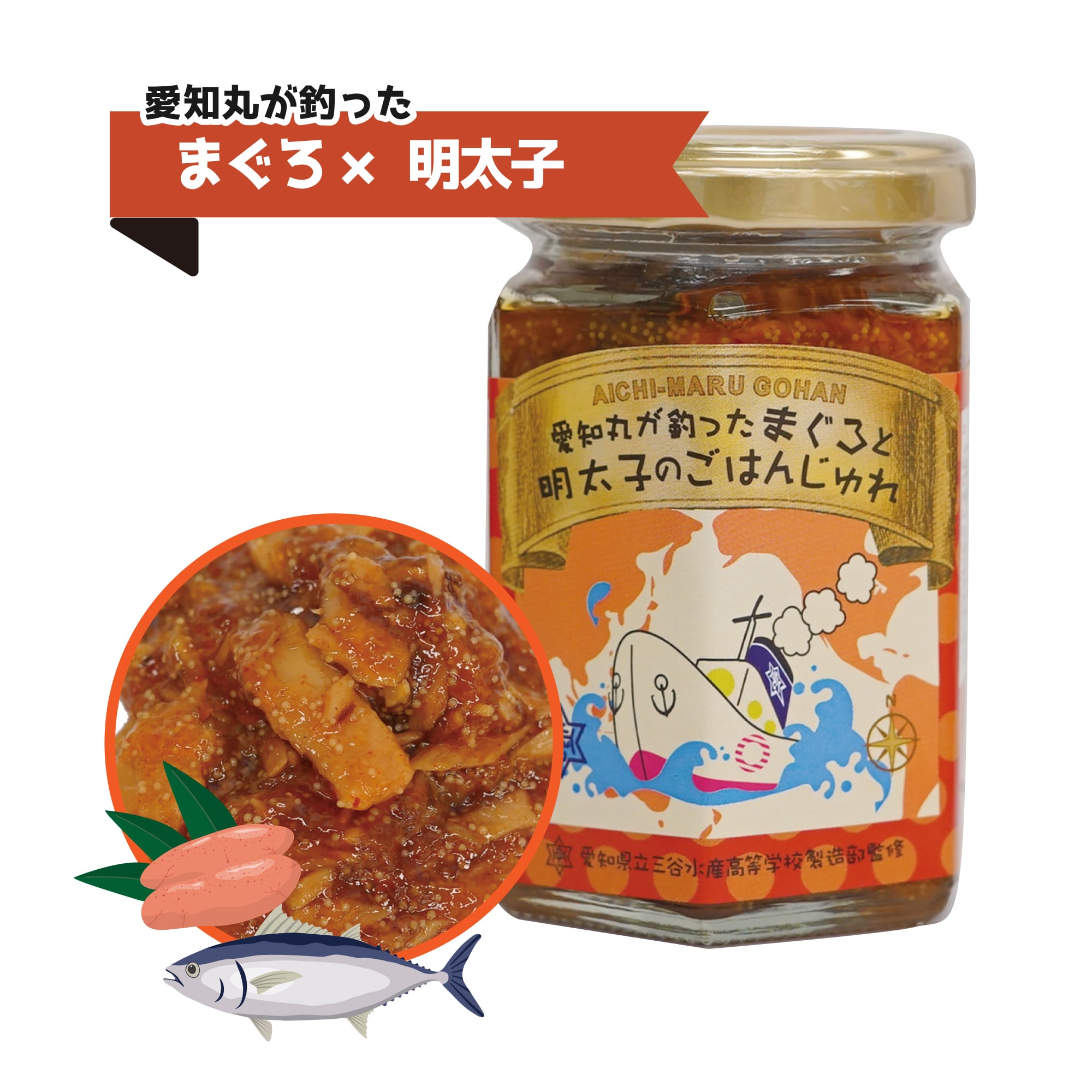 高校生の意見を取り入れ、三谷水産高校の校章と、愛知丸をあしらった、かわいいデザインになりました。