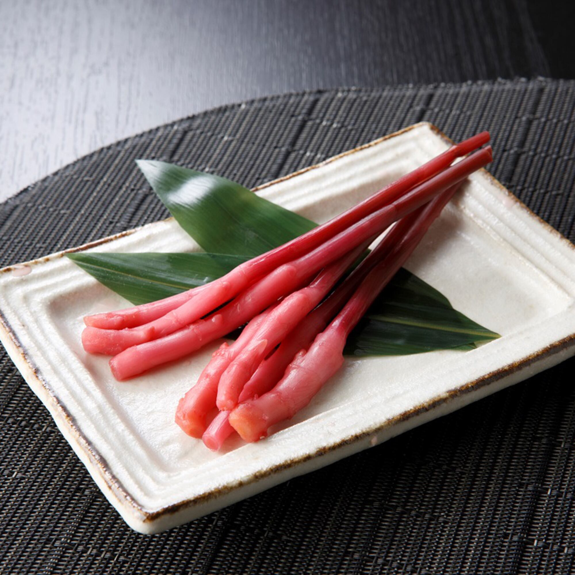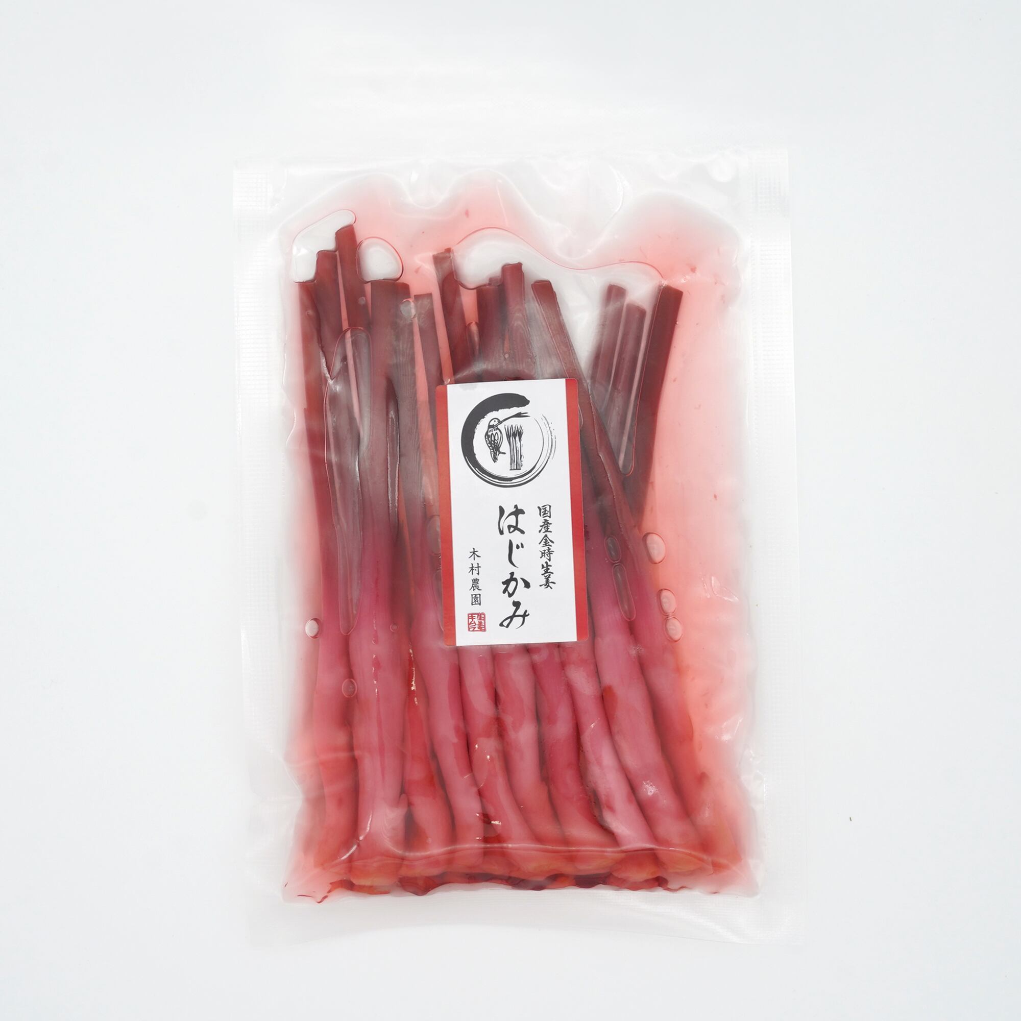 国産の矢生姜(金時生姜)を細かく刻んだものを梅しそに漬けたもので、