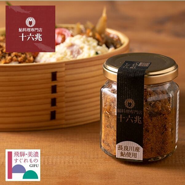 専門店で出すそのままに串で刺し、塩を振り、じっくり炭火で焼き上げた鮎の塩焼きを、手作業で骨と内臓を取り除き、細かくほぐしたもの瓶詰めしました。風味づけにエゴマとあおさを少量加えただけで、「これぞ鮎!」という素材感をたっぷり味わってください。