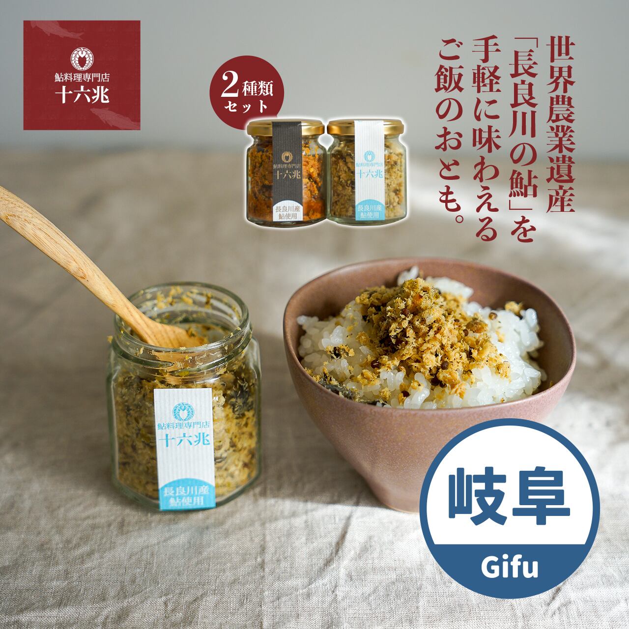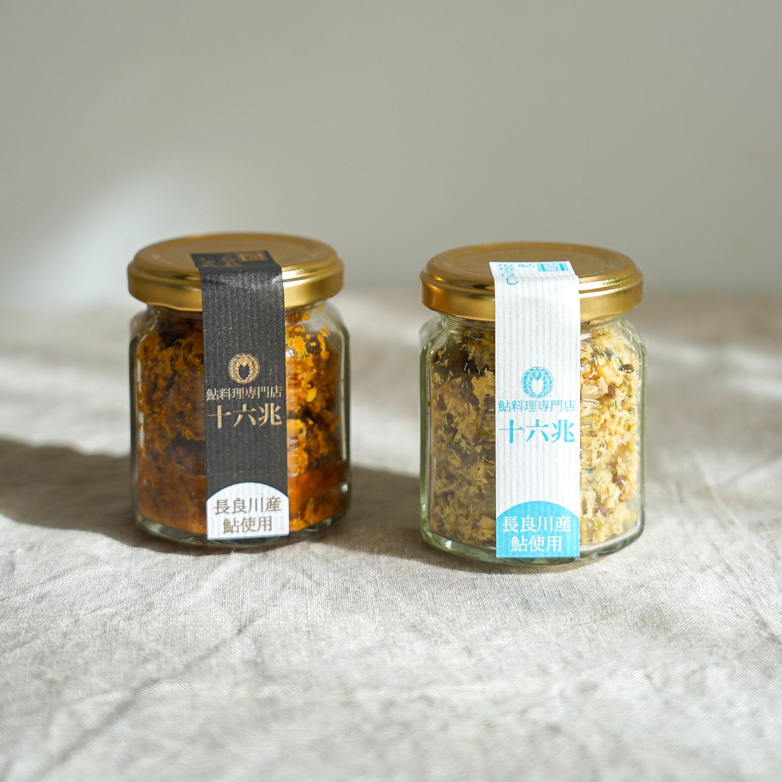 ・原材料/ ●鮎塩焼きほぐし:鮎(岐阜県産)、荏胡麻、塩、あおさ ●子持ち鮎しぐれ:鮎(岐阜県産)、酒、醤油、砂糖、味醂、生姜、蜂蜜、荏胡麻、柚子
