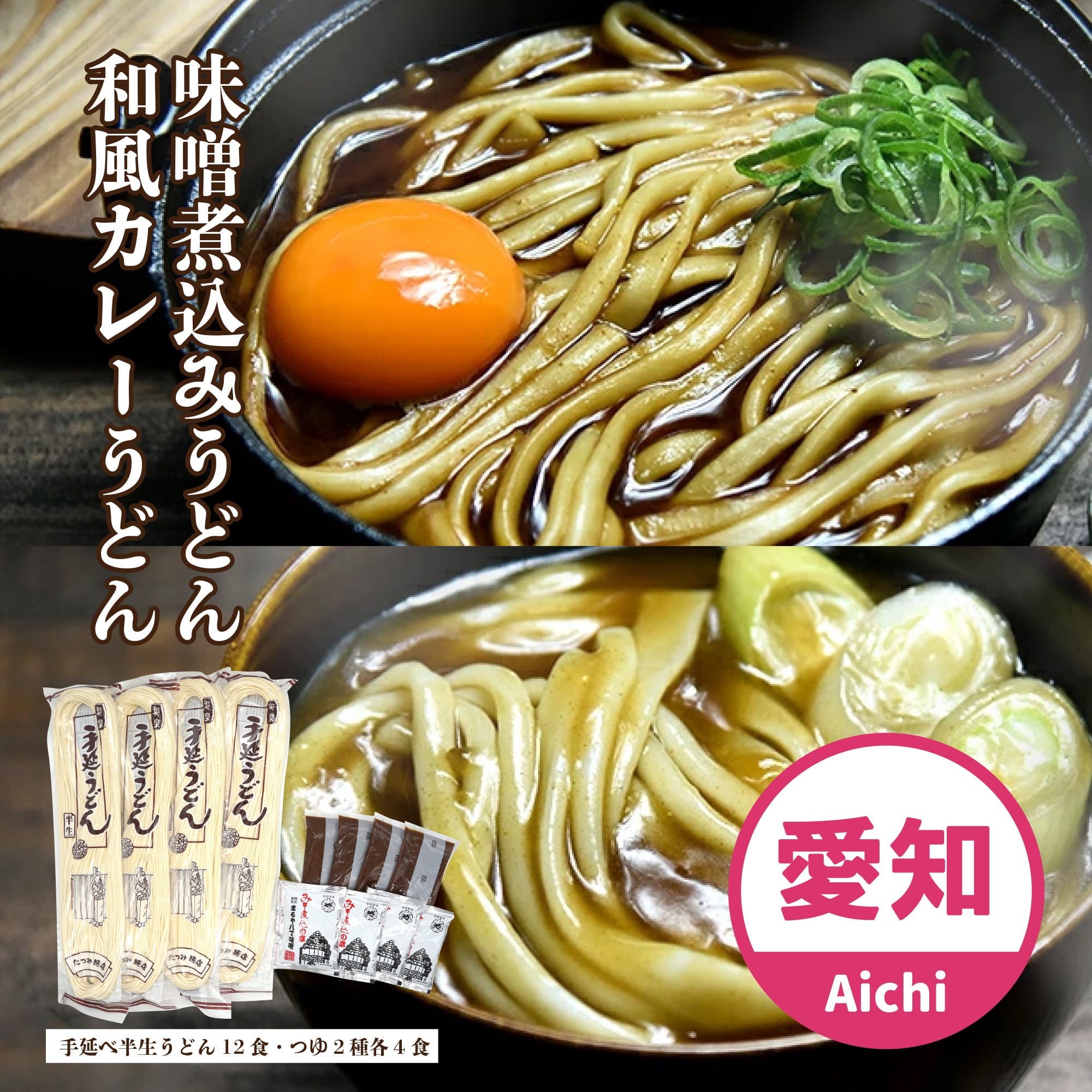 手延べ半生うどん12人前&味噌煮込み・和風カレー各4食セット【愛知県産】