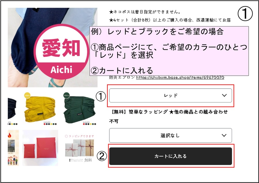 違うカラーをご希望の場合、システム上の関係で1回のご注文で複数のカラーをご選択いただくことができないため、恐れ入りますが下記の手順でご注文をお願いいたします。