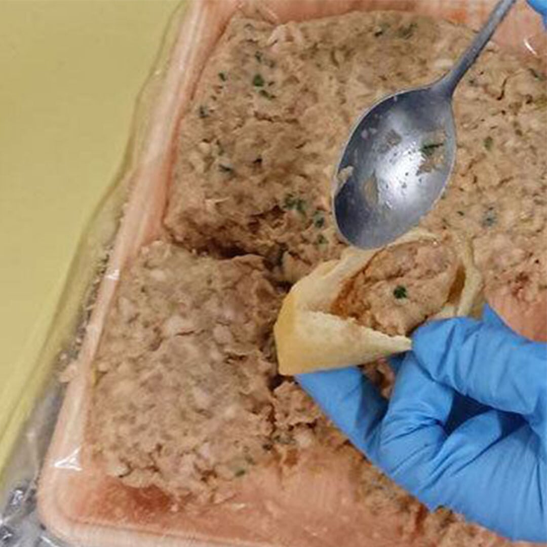 具材は国産の豚肉と鶏肉を贅沢に使用し、新鮮なたまねぎ、キャベツ、にらを絶妙なバランスで練り込みました。隠し味にオイスターソース、ガラスープを閉じ込め美味しい餃子の具に仕上げています。それらの餃子の具をひとつひとつ油揚げに手作業で詰め、急速冷凍させることで餃子の味、風味を逃さないように仕上げました。