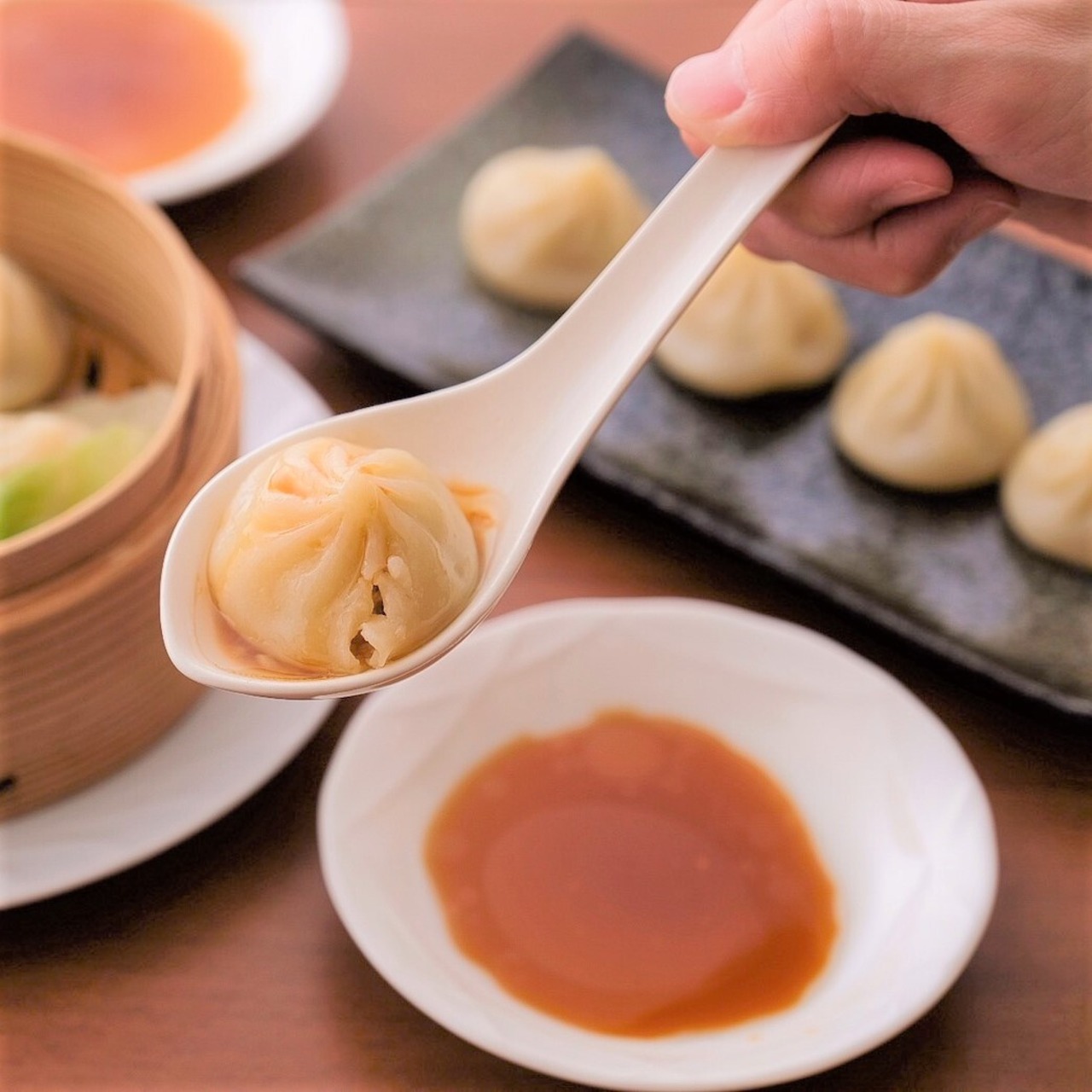 味付けがしっかりしているので、そのままでも美味しく召し上がれますが、まずは、レンゲに小籠包を乗せて箸で割り、スープをひとくち味わってください。次に千切りの生姜を乗せたり、醤油を数滴かけたり、黒酢をかけたりと食べ方は色々。手軽にチューブの生姜でもおいしくお召し上がりいただけます。