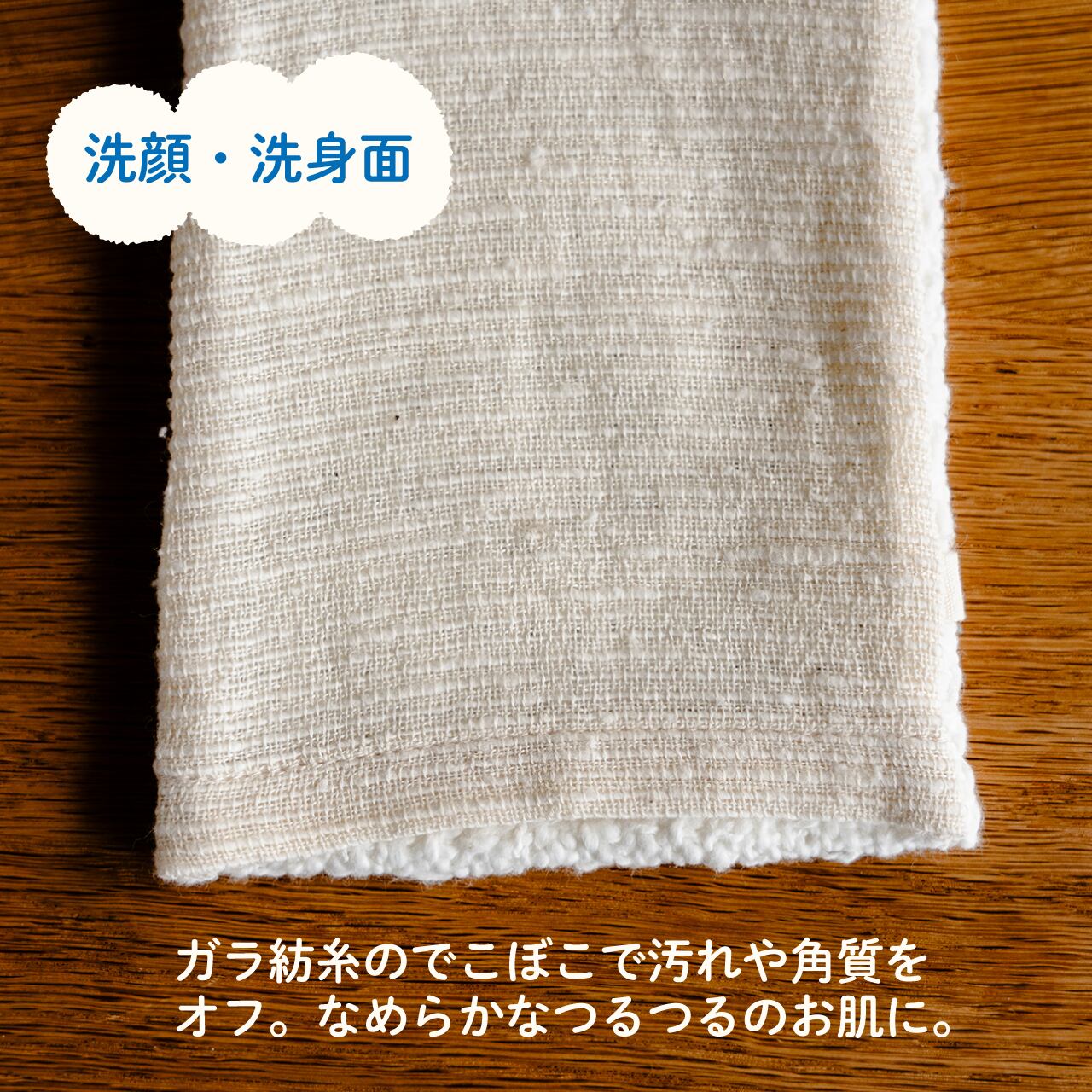 ・顔、体全体をすすいだら本品を洗い絞って厚手の生地面を